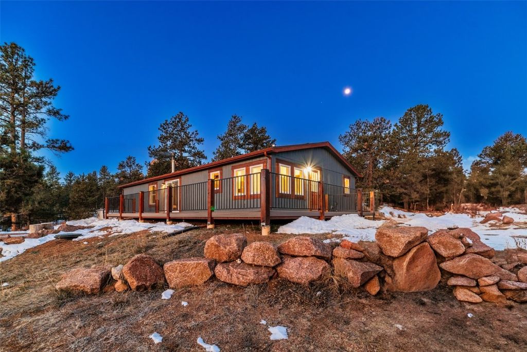 From floor to ceiling, this ranch style home has been beautifully remodeled. The split plan layout and the location make this the ideal full time residence or mountain vacation cabin. A new wrap around trex deck with modern railings leads into a mud room with a laundry room. The completely remade kitchen has abundant storage, classic quartz countertops, state of the art appliances, new skylights, and space for a breakfast nook or coat room. The open living area with a cozy wood burning stove centered on the Nickel Gap wood and tile accent wall is the perfect layout for living/dining space, endless possibilities. Luxury vinyl flooring ensures a lifetime of durability. Sliding doors with built in blinds open out to the deck where you can relax and revel in the best views around; spectacular views of Dog Head, Sheep, Dome Rock, and Pikes Peak in the distance. Right off the deck is a lovely brick and Flagstone patio where you can set up your fire pit and enjoy the iconic views. The primary bedroom is bright and roomy with a walk in closet and the bathroom every couple wants: double sinks, a WC, walk in shower, and space for a linen cabinet. Two additional bedrooms and a full bath complete the living space, room for everyone. A brand new propane furnace will keep you warm during the snowy Colorado winter. New whole house water filtration system designed specifically for the abundant producing well on this property is big bonus for this desired neighborhood. New windows and trim, updated electrical, new roof in 2017, no detail has been overlooked. The lovely two acre lot has an abundance of mature Pines, a gravel drive and parking area, a new retaining wall, a shed for extra storage, two patios, and a garden area. Just 35 minutes from Woodland Park and under an hour from Colorado Springs this exceptional home in a friendly neighborhood has the added advantage of being commutable. It is the ideal mountain escape all ready for you to move in and make it your own.